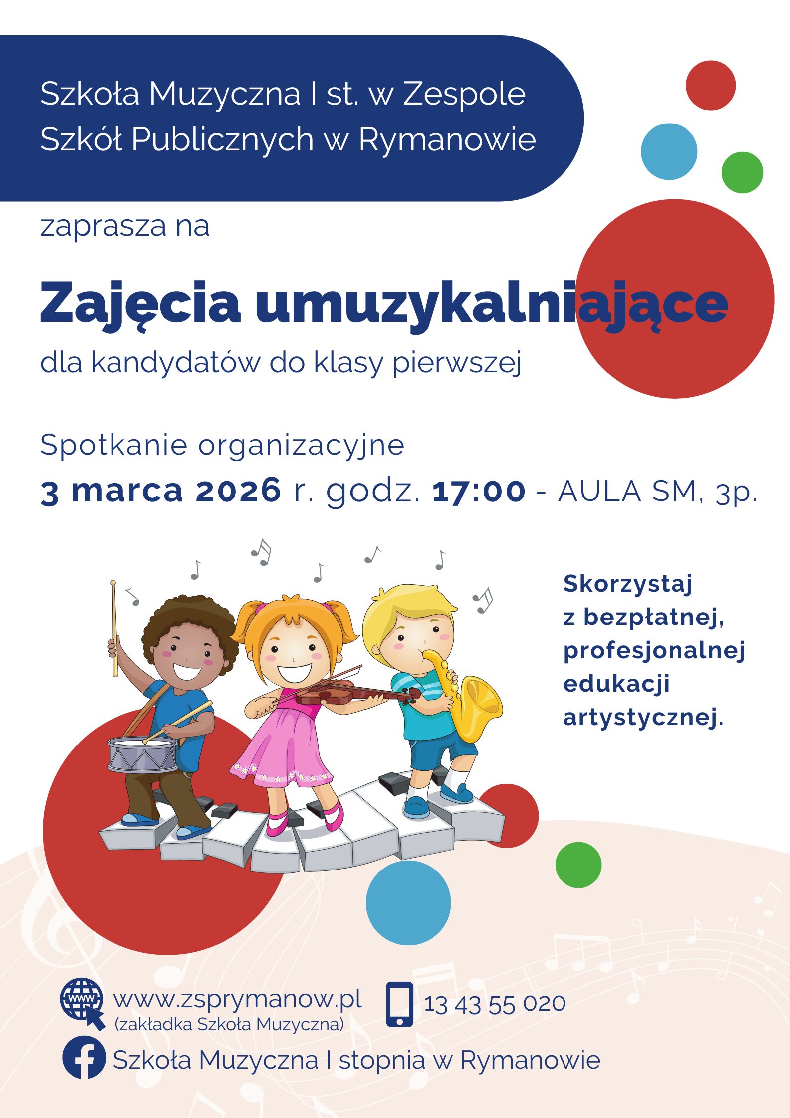 Informacja o zajęciach umuzykalniających dla kandydatów do pierwszej klasy Szkoły Muzycznej I st. w Rymanowie. Spotkanie organizacyjne (dla rodziców, bez dzieci) odbędzie się 19 lutego 2024 roku o godzinie 18:00 – Aula ZSP w Rymanowie. Kurs obejmuje 10 spotkań, w ramach których dzieci poprzez zabawy muzyczne będą rozwijały swoje zdolności rytmiczno-słuchowe. Ponadto, by kandydat mógł w przyszłości bardziej świadomie podjąć decyzję o wyborze swojego głównego instrumentu, w czasie zajęć odbędą się ich prezentacje.